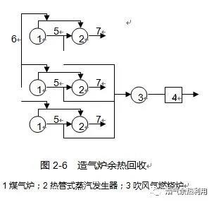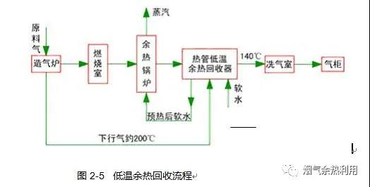 ①在原有廢熱鍋爐后加一臺熱管低溫余熱回收裝置,將廢熱鍋爐出口270℃的氣體降至140℃,同時將下行煤氣(約200℃)也經過熱管裝置,可以回收下行煤氣約60℃溫差的熱量。熱管裝置可以是氣-氣式的,即用回收的低溫余熱加熱進入煤氣爐的空氣或過熱低壓水蒸汽。也可以是熱管省煤器的形式,加熱廢熱鍋爐的給水。其流程圖如圖2-5所示。