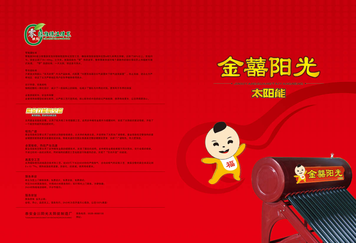 泰安金囍陽光太陽能熱水器是泰安成立較早企業(yè),產(chǎn)品質(zhì)量優(yōu),價(jià)格合理,現(xiàn)公司面向全國市場招商,歡迎各地朋友來洽談合作...... 泰安市泰山區(qū)金囍陽光太陽能制造有限公司是一家專業(yè)從事太陽能研究、開發(fā)、生產(chǎn)營銷為一體化的企業(yè),擁有先進(jìn)的技術(shù),精湛的工藝,成套的機(jī)械化設(shè)備,擁有先進(jìn)的管理機(jī)制和完善的售后服務(wù)網(wǎng)絡(luò);全自動(dòng)流水生產(chǎn)線,亞洲標(biāo)準(zhǔn)的監(jiān)控、檢驗(yàn)保障體系,精心打造出世界級(jí)高品質(zhì)產(chǎn)品。