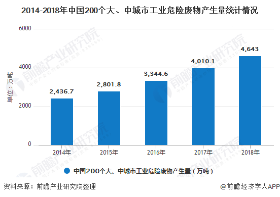 根據生態環境部發布的《全國大、中城市固體廢物污染環境防治年報》數據顯示,2014-2018年信息發布城市工業危險廢物產生量逐年上升。2018年,200個大、中城市工業危險廢物產生量達4643.0萬噸。