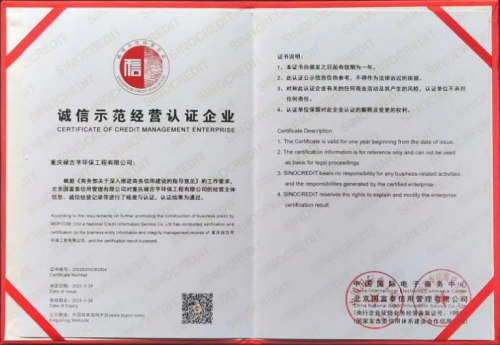 公司一直秉承“重契約、守信用”的經營理念,本著“以誠相待”的原則,堅持為廣大客戶提供優質的服務,使公司獲得了社會各界的高度認可,企業的社會信譽及品牌效應不斷提高。2022年3月,重慶祿吉亨環保工程有限公司榮獲由中國國際電子商務中心、北京國富泰信用管理有限公司(國家發改委信用體系建設合作信用機構)(央行企業征信業務經營備案證號:10013)的“誠信示范經營認證企業”認證。并公示于中華人民共和國商務部、中國國際電子商務中心主管的全國行業信用公共服務平臺。