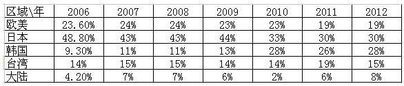 2006-2012全球五大區域LED封裝器件營收占比