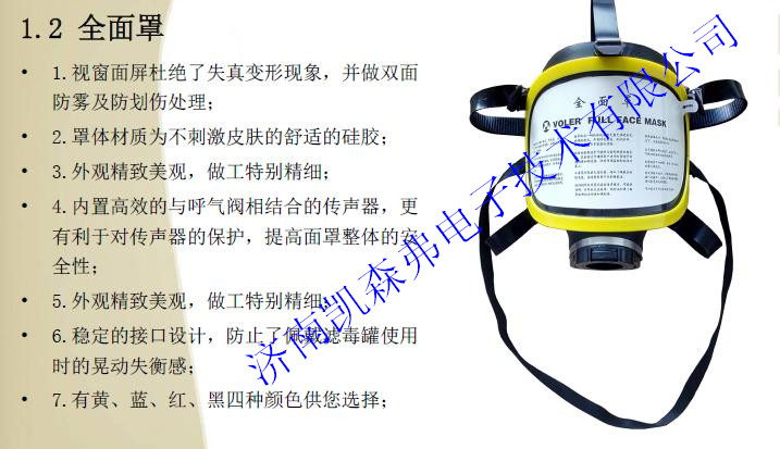 1.空氣呼吸器面罩:為大視野面窗,面窗鏡片采用聚碳酸酯材料,具有透明度高、耐磨性強、具有防霧功能,網狀頭罩式佩戴方式,佩戴舒適、方便,膠體采用硅膠,無毒、無味、無剌激,氣密性能好。