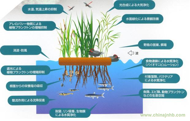 產(chǎn)地:日本 基礎(chǔ)材料:合成樹脂+植物纖維 重量:10kg/㎡ 浮力:35kg/㎡ 適用水位:水深50cm以上、水位波動不大的水體 適用水域:淡水區(qū)域(貧營養(yǎng)區(qū)域植物生長不好) 作用:1、水面綠化--水面的綠化修飾 2、生物生息空間--鳥類、魚類、昆蟲的采食、營巢、產(chǎn)卵、休息空間 3、凈化水質(zhì)--植物和微生物吸收營養(yǎng)鹽,植物的遮光效果抑制浮游生物的生長 4、消波效果--防止水波對護岸的侵蝕