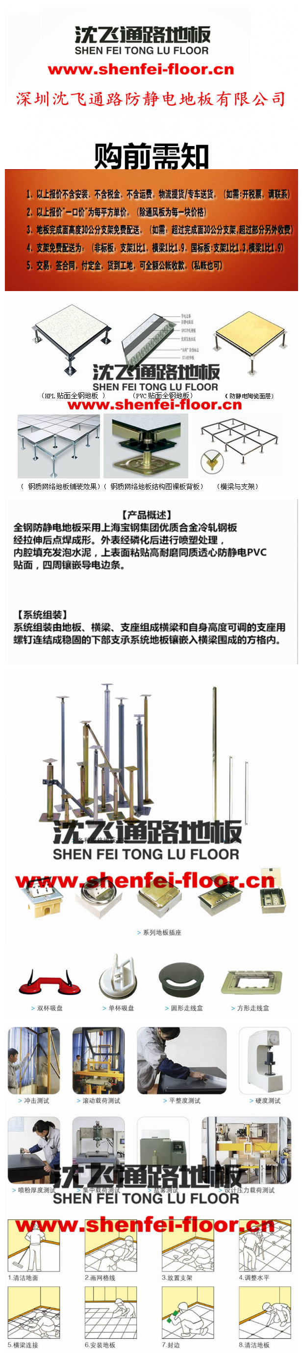 1、全鋼結構,數控多點焊接,結構堅實、平整度高、承載能力強。鋼殼靜電噴塑,耐磨、防潮、防腐蝕。 2、強力環保膠水粘貼高耐磨飾面,不起泡、不脫膠,有效防止靜電,裝飾性強,抗污阻燃。 3、地板四周采用優質膠邊牢固鑲嵌,邊角整齊,尺寸精度高。502膠水二次加固,穩固性高。 4、四周支撐,組裝靈活,下部空間可作為布線及空調通風用,維修方便。