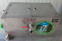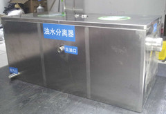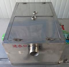隔油器由三個槽(400型、500型為兩個)組成,當含雜物排水流入第一槽時,雜物框即將其中固體雜物(菜葉等)截流除去。進入第二槽后,由幾個擋板控制水的流速和方向,利用密度差