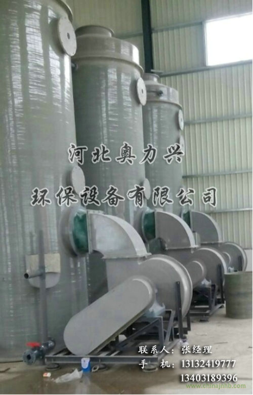 本裝置采用氫氧化鈉溶液為吸收中和液來凈化廢氣。氣體在離心通風機的吸力下進入多級凈化塔,在凈化塔中噴嘴噴出的堿液與氣體接觸,發生中和反應。根據廢氣參數不同,可以采用一級或多級凈化,如果溫度太高,可以采用降溫措施后再進入凈化塔處理,凈化達標后的氣體排入大氣中。