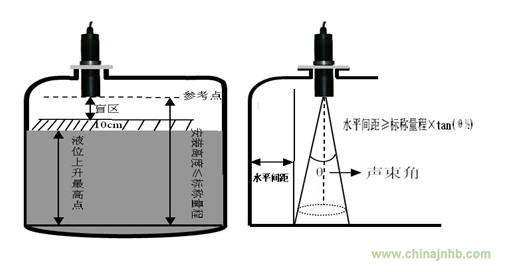 1、傳感器和最高物位之間距離應大于盲區(空距≥最高物位+盲區)同時要保證傳感器軸線應垂直于被測物面。 盲區即傳感器到測量液(物)面最小距離,在這一區間內儀表無法正常工作,一般取值小量程設30cm~60cm之間,大量程設60~100cm之間。
