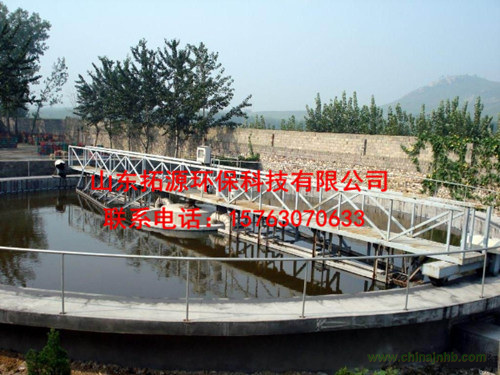 工作橋由安裝在周邊的驅動機構帶動,繞安裝的池中心支墩上的中心支座旋轉,沉淀在池底的污泥由集泥板集至各吸泥口,在液位差的作用下,污泥經吸泥口、集泥槽、虹吸管、中心泥罐、排泥管排至池外。每個吸泥管上端設有排泥量調節閥,以調節各吸泥管的流量和濃度。液面上的浮渣在浮渣刮板和周邊擋渣堰形成的漸縮區 域集中,由浮渣刮耙到集渣斗,排出池外。