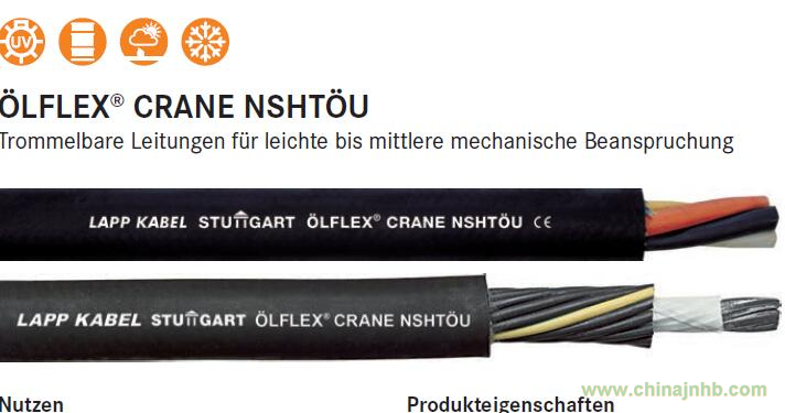 優勢供應LAPPKABEL NSHTOU卷筒電纜,LAPPKABEL STUTTGART OLFLEX CRANE NSHTOU【?LFLEX® CRANE NSHT?U】卷筒電纜,適用于低度和中度機械應力的卷筒電纜,不僅用于動力拖鏈,還可用作纜索、卷筒電纜和牽引電纜; 整體承載編織,防止電纜發生不必要的扭曲,并形成所謂的螺旋形效應,堅固且高效,適用于室外,護套整體承載編織