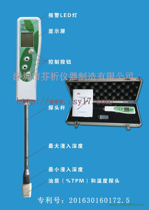 CSY-SDC食用油品質檢測儀快速檢測油脂中的極性組分的總含量,深圳市芬析儀器制造有限公司研制生產的食用油品質檢測儀,利用極性物質與非極性物質的導電能力不同,通過測量兩極的電價差,精確判斷極性物質與非極性物質的百分比,可以在幾秒鐘時間內準確計算極性物質的含量,具有操作簡單快速,非破壞性,不使用溶劑等優點;同時由于溫度對極性物質含量的影響,食用油品質檢測儀可以同步顯示溫度值。