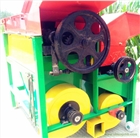 四主軸玉米脫粒機,工作時,玉米由進料口喂入,玉米在高速旋轉的轉子與滾筒內受到撞擊,籽粒由篩孔分離出去,玉米芯從機器背面排出,玉米絲,皮從抽風機風口排出。進料口設在機器上蓋上部,玉米棒通過進料口進入脫粒室,整根玉米在脫粒室內受到高速旋轉的轉子撞擊玉米粒脫落,通過篩孔分離出去, 另喂入口前下部設有門板,防止脫落的玉米粒飛濺而出傷人。該種機器,脫粒的效率由滾筒的長度和直徑而確定,用戶可根據自己的脫粒效率,合理選用此系列玉米脫粒機。轉子上的甩錘是易損件,應經常檢查其磨損情況,當甩錘磨損四分之一時,可更換新甩錘,如修復更換新甩錘時,必須全部修復或更換,以保證轉子的平衡。