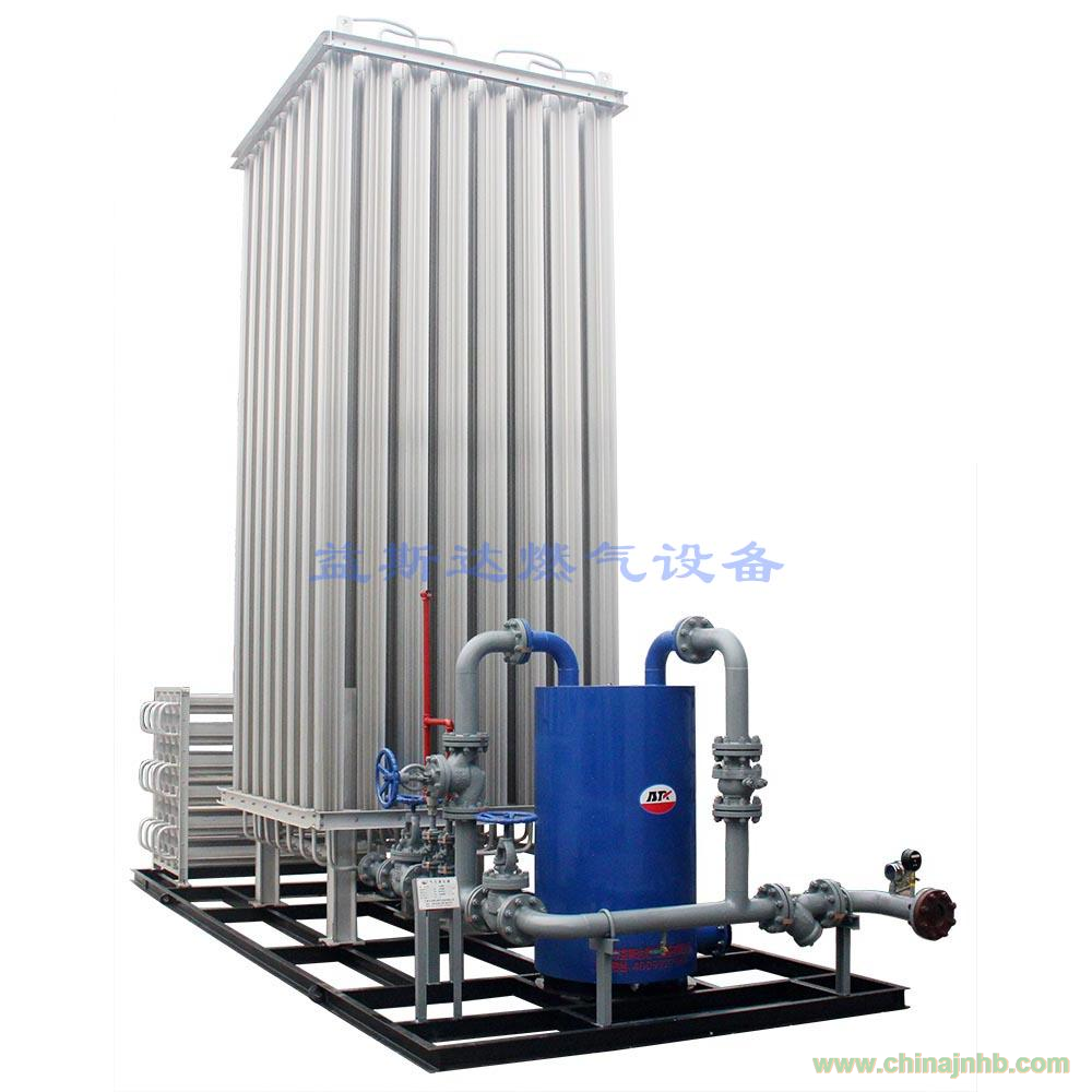 LNG槽車直供氣化站是直接將LNG槽車作為儲罐,槽車通過卸車增壓器維持罐內(nèi)壓力,槽車氣、液相管直接與站內(nèi)氣、液相管連接,利用槽車內(nèi)壓力將LNG輸送到空溫式氣化器,在氣化器中液態(tài)天然氣過熱并氣化,轉(zhuǎn)化為氣態(tài)天然氣,氣態(tài)天然氣在經(jīng)過調(diào)壓計量、加臭使之達到使用的壓力,經(jīng)管網(wǎng)輸送到終端。一般情況下,氣化后的天然氣溫度低于-5℃時,空溫式氣化器后需增加復(fù)熱器,來提高天然氣溫度,使天然氣溫度高于5℃。