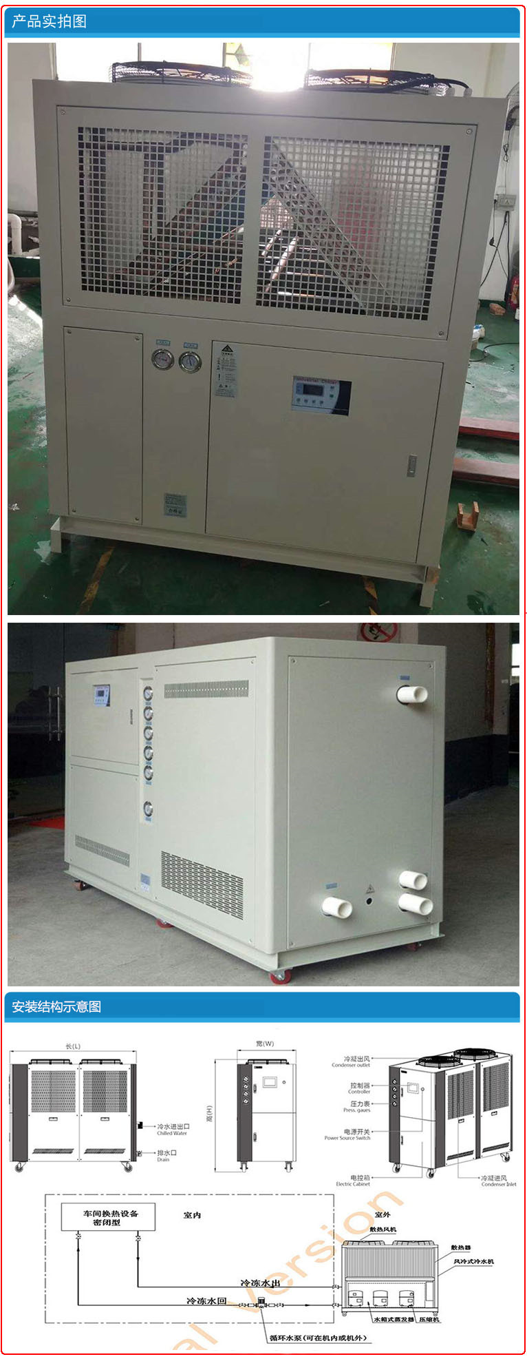 風冷式冷水機正常工作時,電壓為380V(其中DYJ-01A~DYJ-02A的電壓為220V,國外其他地區電壓也有410V等),電流在11A-15A范圍內為正常;