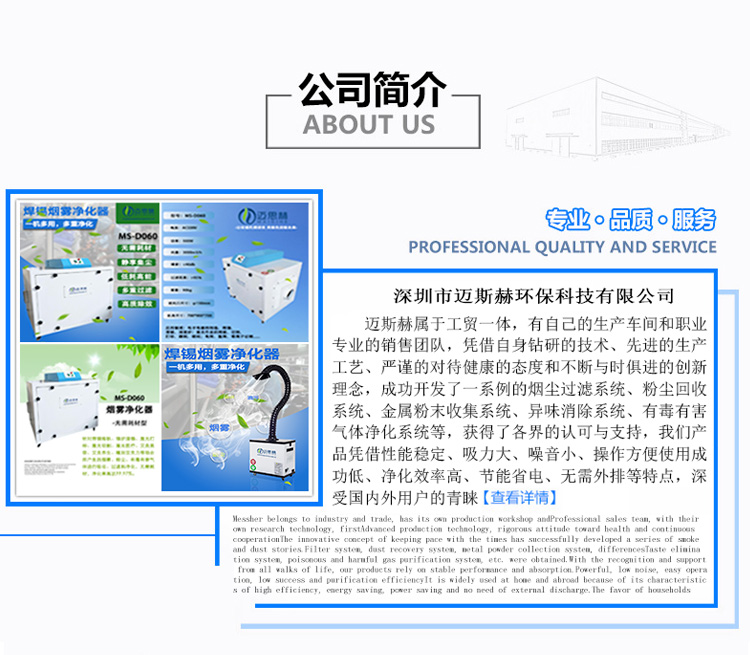 深圳市邁思赫環保科技有限公司 溫馨提示:產品規格繁多,詳情請咨詢!181-384-338-62 邁思赫憑借自身鉆研的技術、先進的生產工藝、嚴謹的對待健康的態度和不斷與時俱進的創新理念,成功開發了一系列的煙塵過濾系統,粉塵回收系統,金屬粉末收集系統,異味消除系統,有毒有害氣體凈化系統等,該系列產品憑借性能穩定、吸力大、噪音小、操作方便、使用成本低、凈化效率高、節能省電、無需外排等特點,深受國內外用戶的青睞。