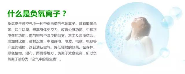 舉個再簡單不過的例子,人一進入公園或者野外就會覺得心曠神怡,除了視野開闊外。一個很重要的原因就是這里空氣清新,空氣中負氧離子濃度高。在不同的地區,空氣中的負氧離子濃度差別是很大的,森林、海濱、瀑布的負氧離子遠遠多于人口密集污染嚴重的城市,這也是我們為什么會選擇這些地方作為我們養生保健圣地的原因。專家依據這一現象,經過多年研究及臨床試驗發現,負氧離子對人體的保健作用不僅僅表現在可以使人們呼吸新鮮空氣保持心情舒暢,它還可以消減體內自由基,抗氧化防衰老,降低血液粘稠,增強人體免疫力,對失眠焦慮、高血壓、糖尿病、哮喘甚至癌癥等現代社會常見頑疾,都有一般藥物不能企及的療效。