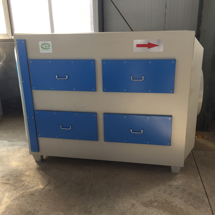 當廢氣由風機提供動力,負壓進入吸附箱后進入活性炭吸附層,由于活性炭吸附劑表面上存在著未平衡和未飽和的分子引力或化學鍵力,因此當活性炭吸附劑的表面與氣體接觸時,就能吸引氣體分子,使其濃聚并保持在活性炭表面,此現象稱為吸附。利用活性炭吸附劑表面的吸附能力,使廢氣與大表面的多孔性活性炭吸附劑相接觸,廢氣中的污染物被吸附在活性炭表面上,使其與氣體混合物分離,凈化后的氣體高空排放。 活性炭吸附箱是一種干式廢氣處理設備,由箱體和填裝在箱體內的吸附單元組成。