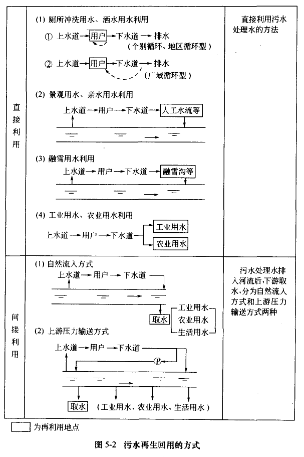污水再生回用設備的方式(圖5.2)有直接利用和間接利用兩種,本章以直接再利用方式為對象。其用途(圖5—3)為廁所沖洗用水、撓灑用水、景觀用水和親水用水利用等。