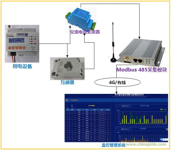 現在介紹Modbus 485采集模塊使用的一種模式,主要應用于用電行業,這就是“交流電流變送器+Modbus 485采集模塊+信息上報平臺/信息添加到視頻畫面上”。