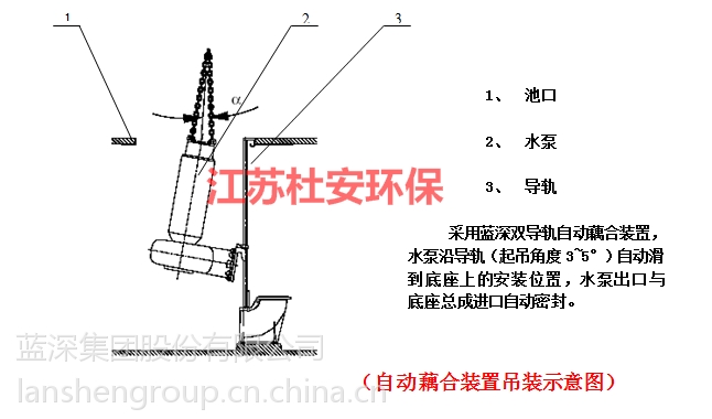 潛水離心泵—應(yīng)能沿不少于兩根的平行導(dǎo)桿上下移動(dòng),自動(dòng)與預(yù)置于坑底部的耦合裝置相連接且定位準(zhǔn)確。提升時(shí),耦合自動(dòng)脫落。