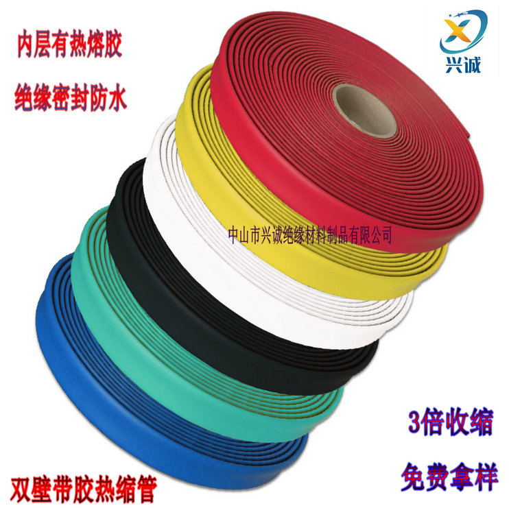 彩色雙壁含膠熱收縮套管由輻射交聯聚烯烴材料和熱熔膠雙層構成,外層聚烯烴絕緣、阻燃、理化電氣性能優異,內層熱熔膠能緩沖機械應變和密封性強。主要功能是絕緣、密封、防水、防腐、防漏氣等,廣泛應用于各類線束、電線電纜和金屬管棒等的密封絕緣、防水防腐等領域。其收縮倍率達3-5倍,收縮后熱溶膠能將連接兩端的材料完全密封,易施工、不需保養,能耐惡劣環境、濕氣等沖擊,達到保護零組件作用,應用于線纜接續、線纜和元器件的密封防潮、防水、防蝕防漏氣和絕緣保護,修復受損的線纜絕緣層,電線分支處的密封固定,金屬管線的防腐保護,電線電纜的修補,水泵和潛水泵的接線防水等。