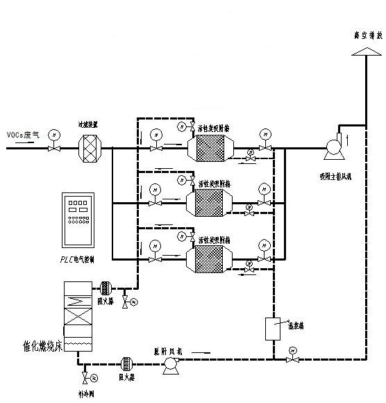 本裝置主要由組合干式過濾器、活性炭吸附箱、電、氣動調節閥門、催化凈化裝置、混流換熱裝置、voc在線監測儀器、阻火器、離心風機、電氣控制等部分組成。