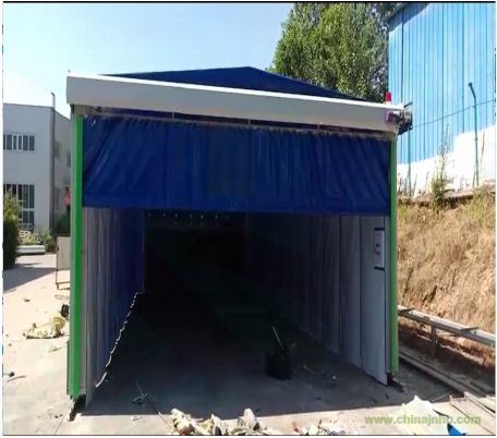 室外安裝的移動式噴漆房。室外露天移動伸縮噴漆房是將伸縮房放在室外,它的設計制造與室內使用的移動伸縮房相比,需要增加防雨功能。通常的做法是在伸縮房的頂端加上契形柱子,上面覆蓋蓬布,以達到防雨效果。還有一種方法是將伸縮連桿放在主柱中間,蓬布安在外面。以達到保護主柱框架不被雨淋的效果。