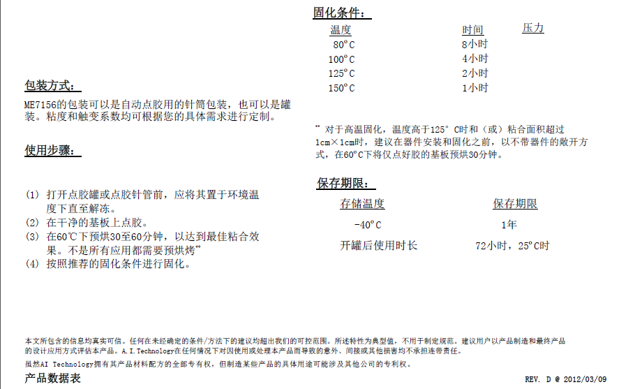 包裝方式:ME7156的包裝可以是自動點膠用的針筒包裝,也可以是罐 裝。粘度和觸變系數均可根據您的具體需求進行定制。
