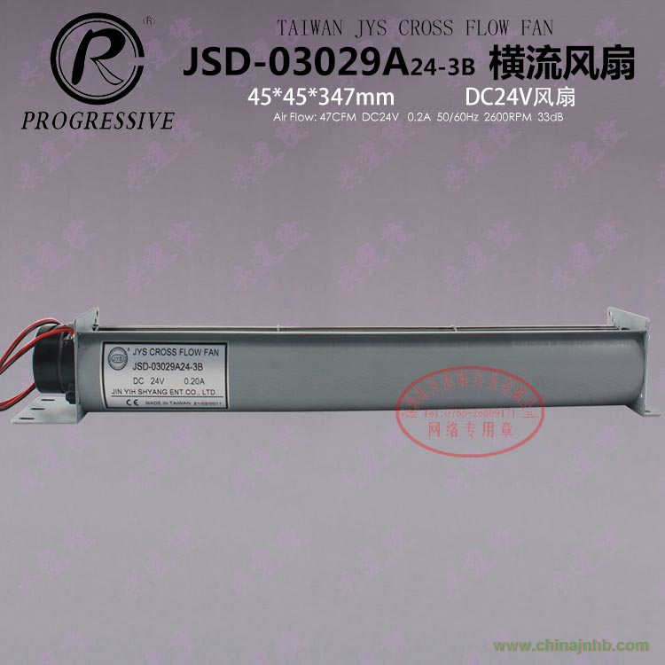 臺灣金億翔JYS貫流風機JSD-03029A24-3B,2600轉超高轉速超大風量,雙滾珠軸承,扇葉直徑為30mm的橫流風扇,DC24V,散熱長度為300mm,風機總長度(含電機)是347mm,空氣凈化器等設備用貫流風機!
