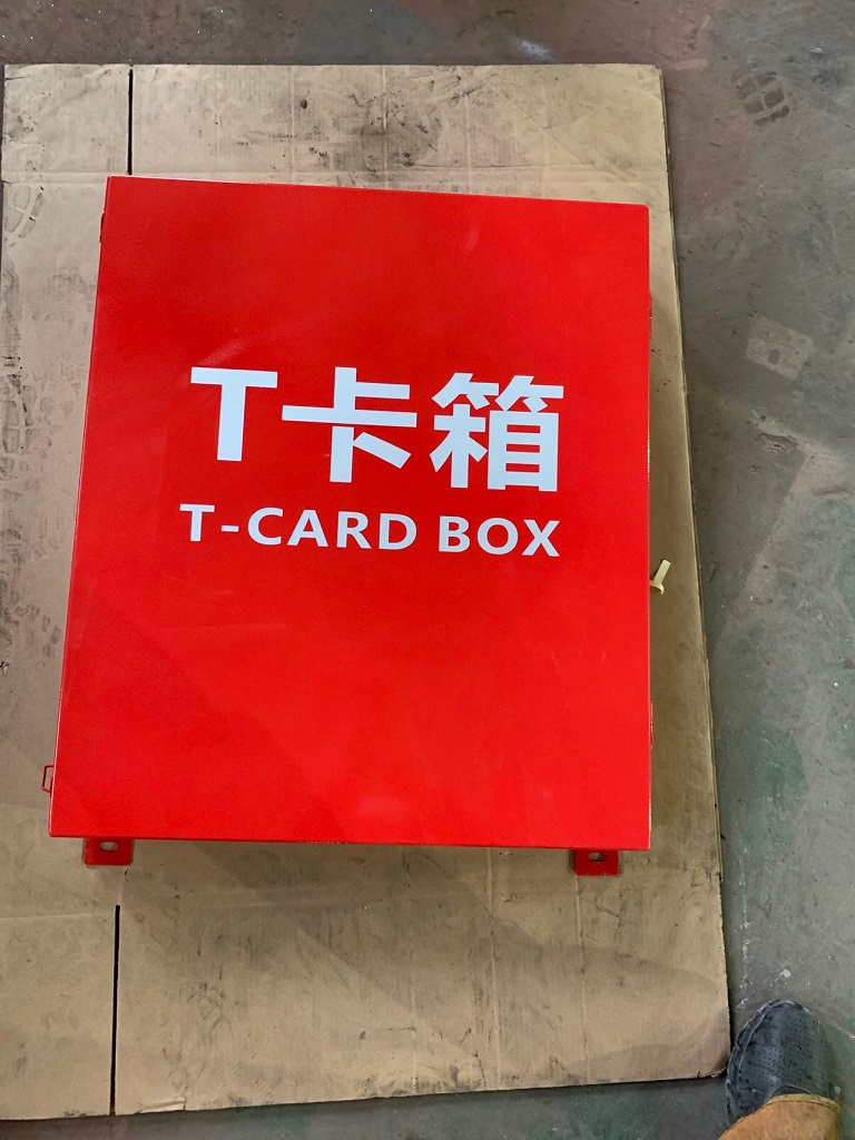 T卡箱外面和卡槽板上均噴有中文“T卡箱”及英文“T card box”標(biāo)識(shí),美觀大方,箱口做風(fēng)雨密處理,箱門邊安裝防水密封條,進(jìn)行密封防水;T卡箱整體噴塑處理(防銹防腐),內(nèi)部卡槽板激光開插卡槽(卡槽數(shù)量客戶指)。